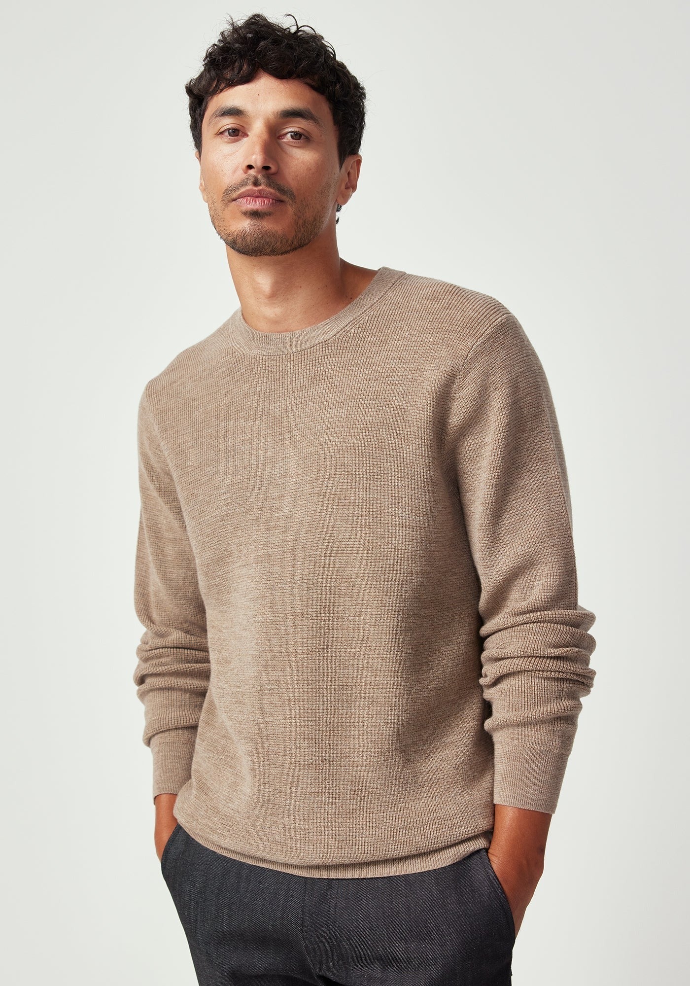 Take it easy in the Theo Sweater, a great addition to your all-year-round wardrobe. This versatile crew can act as an outer in warmer weather, or layer it up with coats and jackets when its cold. A mid-weight knit with textured knit structure throughout.