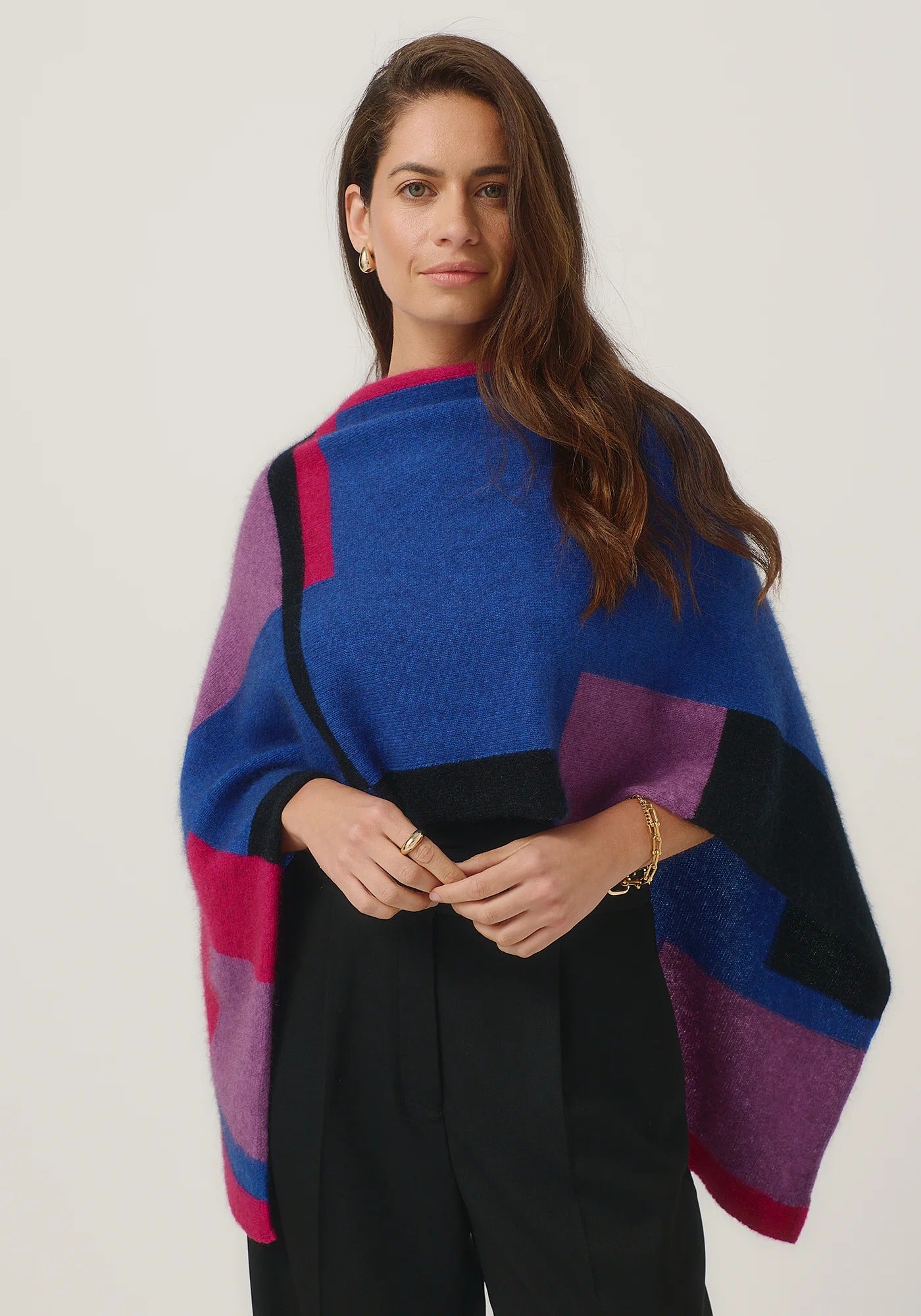 The Empress should have been called impress, as you'll be sure to turn heads in this one! With its bold colour blocking and timeless design, the Empress Poncho is statement piece you'll love.